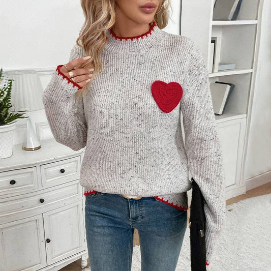 Half Turtleneck Valentine's Day Heart Pattern Sweater Crew Neck Casual Pullover