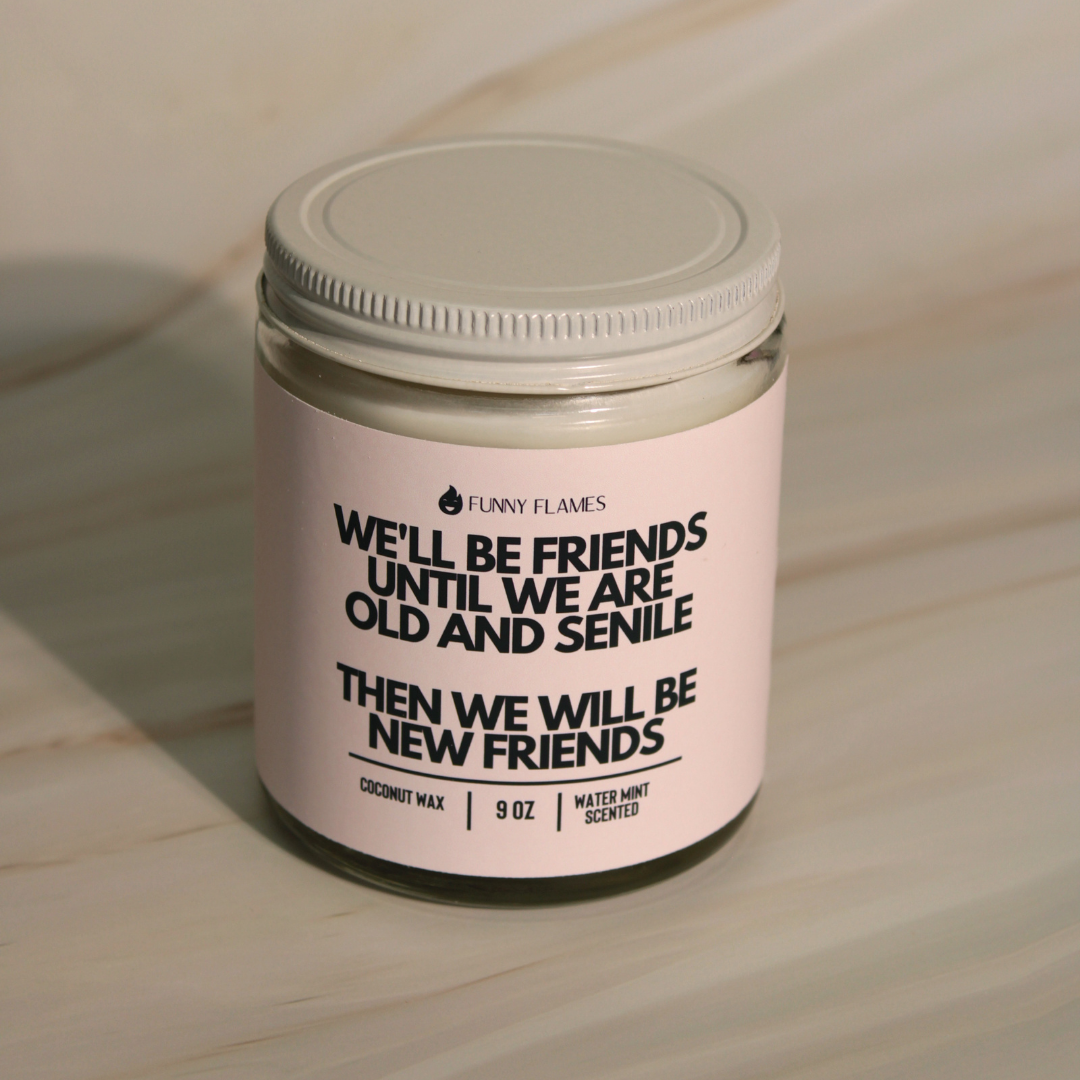 "We'll Be Friends Until We're Old And Senile" candle, crafted with a coconut apricot wax blend that's as smooth as our inside jokes and as sweet as the memories we'll laugh about when we're wrinkly and wise. Scented with the refreshing essence of watermint, this candle will have you reminiscing about all the hilarious adventures we've had and the many more to come! When you light this candle, you'll be transported back to those belly-laughing moments when we couldn't catch our breath, and the only thing on our minds was making more epic memories together – even if we were already a little senile back then! Whether we're reminiscing about our wild shenanigans or creating new ones, this candle's got our back. Scent: Watermint Size: 9oz Glass jar with lid Wax: Coconut apricot wax blend 9oz